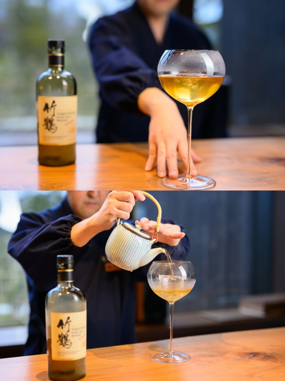 口径の広い大ぶりのワイングラスに大きな立方体の氷を1個。そこに近隣の余市町が誇るニッカウヰスキーの「竹鶴」を注ぐ。隠し味に黒蜜を垂らし、温かいほうじ茶を静かに注ぎ入れ軽くステア。仕上げにヒマラヤ岩塩を削りかけて完成だ。竹鶴のスモーキーフレーバーと濃いめに蒸したほうじ茶の香ばしさが鼻腔に広がり黒蜜がコクを加える。微かな塩味が全体を引きしめる。和と洋が違和感なく溶け合い、優しく喉を滑り落ちていく。氷が溶けゆくにつれ、味わいと温度が緩やかに変化し、長い余韻を愉しむ一杯に仕上がっている。